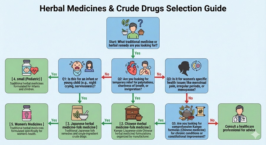 This guide helps you navigate through traditional Japanese and Chinese herbal medicines. Follow the diagnostic flowchart to find the category that best matches your health needs, then use the comparison table to understand the differences between categories.